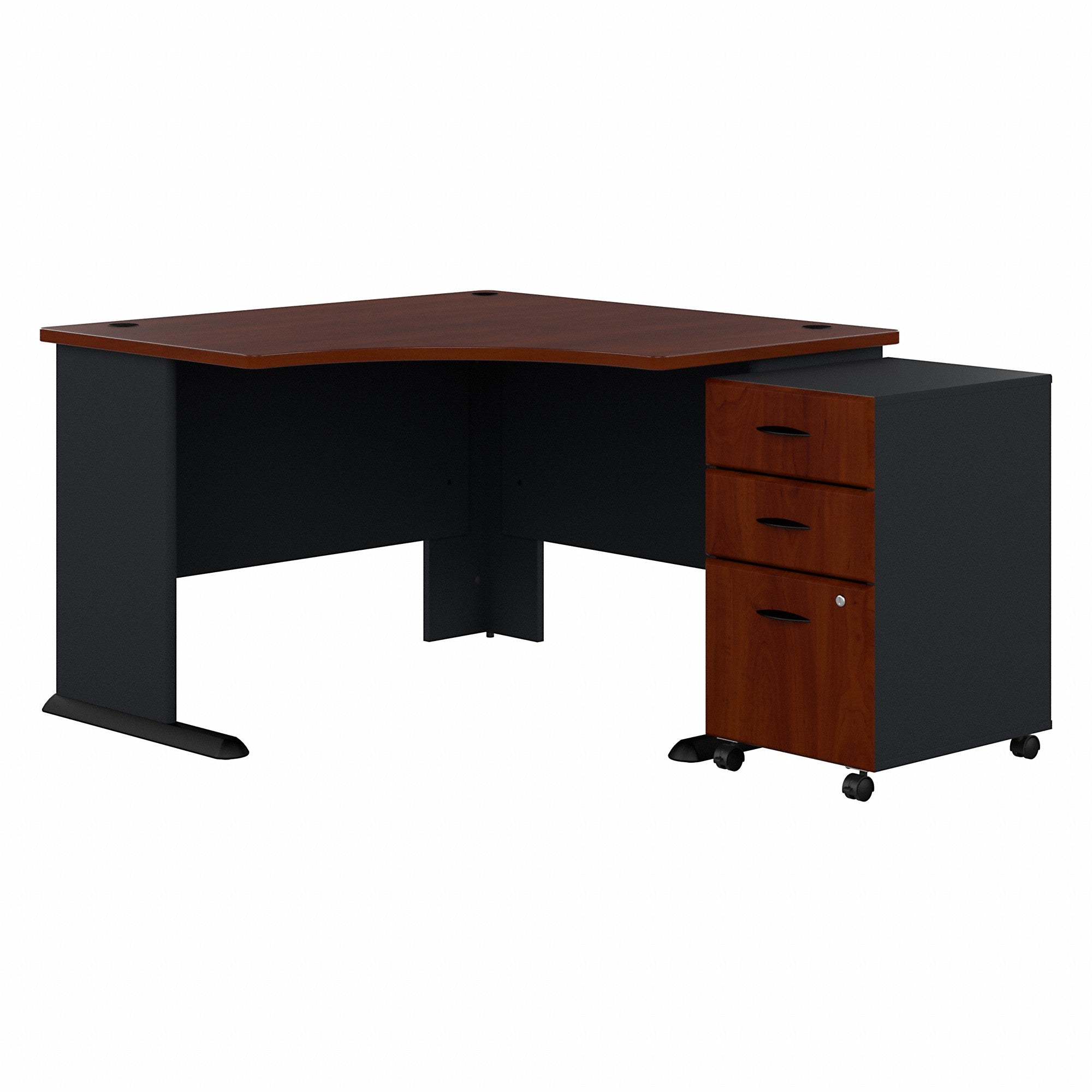 Bundle includes: 48W Corner Desk, 3 Drawer Mobile File Cabinet. Thermally fused laminate finish, durable edge banding and thick end panels resist damage. Corner Desk provides comfortable curved work area and C-Leg design to maximize legroom. Desktop includes wire management grommets to neatly organize cords and cables. Thoughtfully designed for maximum stability and includes hardware to anchor the office desk to a wall . Mobile File Cabinet locks for your security, has 2 box drawers for office supplies and a full-extension file drawer for letter, legal and A4 documents. Series A makes the most of any space with endless configuration options and multiple two-tone finishes to match your style. Meets ANSI/BIFMA quality test standards for performance and safety. American made with U.S. and imported parts. Backed by the Bush Business Furniture 10 Year Manufacturer's Warranty.