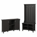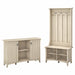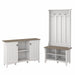 Bundle includes: Hall Tree, Shoe Storage Bench, Accent Storage Cabinet with Doors. Hall Tree mounts to Shoe Bench and features three double prong hooks to hang coats, scarves and hats. Shoe Bench includes four open cubby spaces with two adjustable shelves for flexible storage of footwear and other items. Accent Cabinet offers concealed storage as well as a central compartment to display your favorite decorations. Distressed finish options include a cream colored Antique White, Pure White with Shiplap Gray, Cape Cod Gray, Vintage Black, Ash Brown, Reclaimed Pine and Driftwood Gray. Sturdy Bench surface measures 32W x 16D and supports up to 250 pounds, making it an ideal place to sit while putting on or taking off shoes. 2 Door Storage Cabinet contains two adjustable shelves, one behind each door. Perfect for organizing an entryway, hallway or living room in homes with casual style. Tapered legs, curved base rails and decorative wood accents inspired by timeless Mission styling. Backed by the Bush Furniture 1 Year Manufacturer's Warranty.