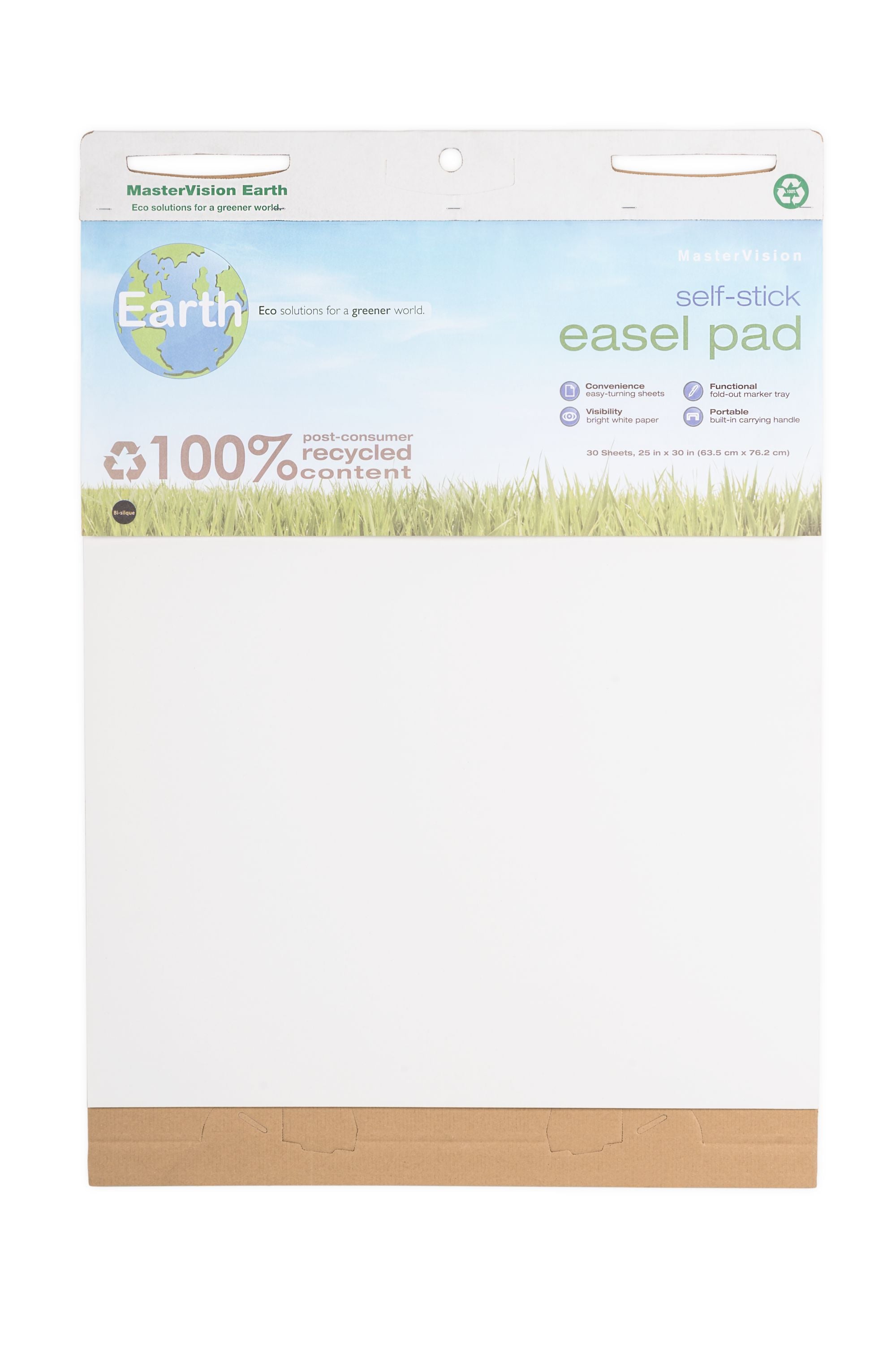 The Earth Self Stick Easel Pad is a collaborative tool with a conscience. Manufactured with 100% post-consumer recyled waste paper fiber, this portable easel pad has a built in carrying handle and fold out marker tray making it easy to capture notes from brainstorming sessions wherever they happen. The bright white unlined 18 lb. recycled paper prevents bleed through to the next page. Each page contains a self-stick backing that is easy to apply and remove to most surfaces without leaving residue behind.