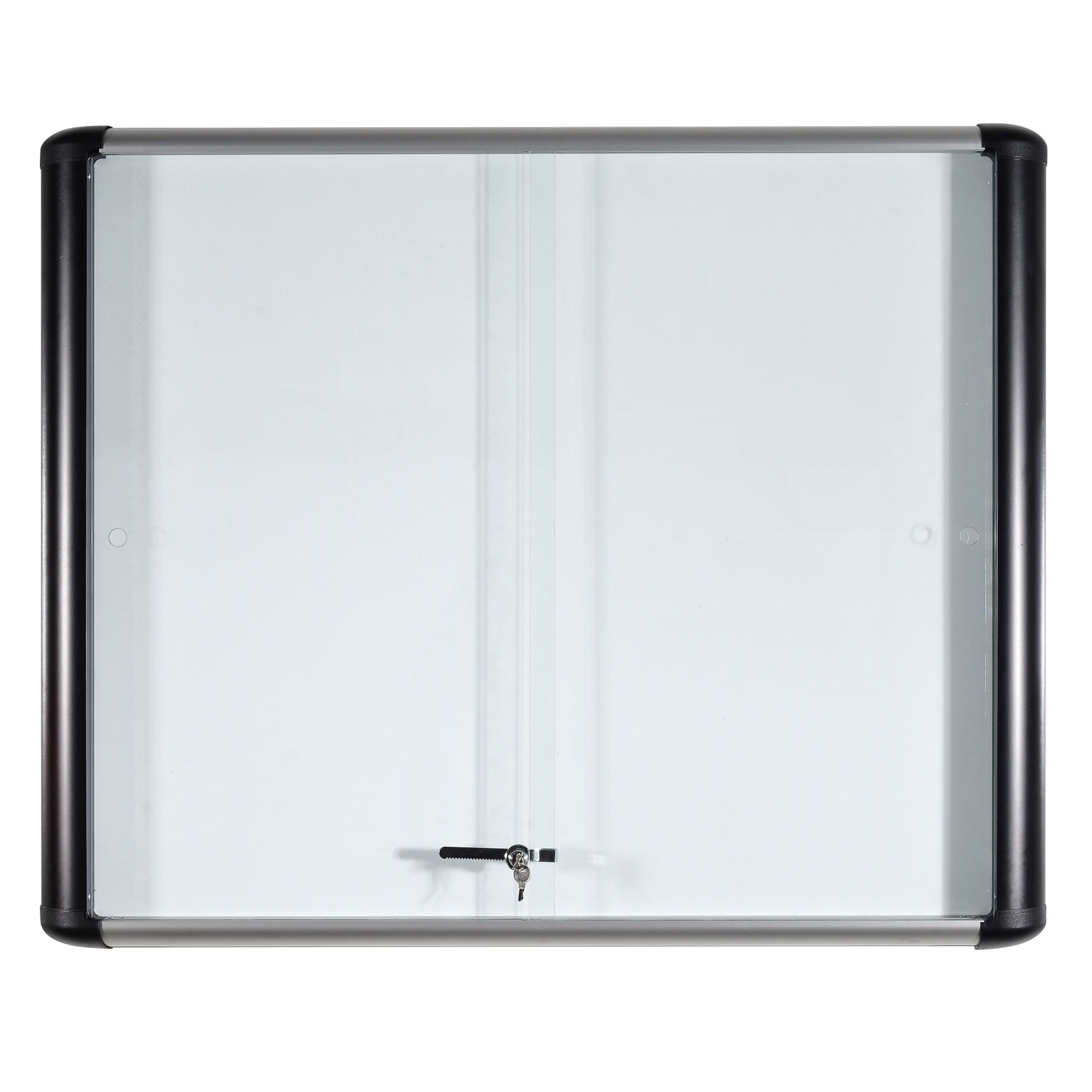 Keep your message secure with this enclosed porcelain dry erase board. With a modern design, the MVI enclosed board is equipped with two tempered glass sliding doors. The magnetic dry erase porcelain enamel board surface is rated for extensive use, resists scratching, ghosting and dents and carries a limited lifetime warranty. The contemporary designed MVI enclosed board has a sturdy anodized aluminum frame and is equipped with a wall fastening kit, lock and two keys.